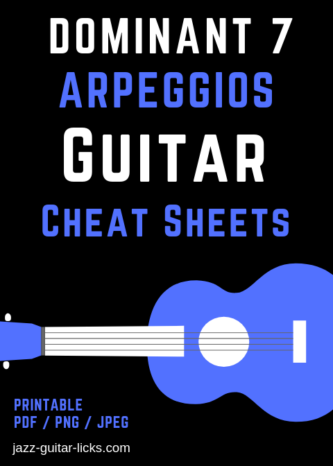 Printable guitar cheat sheet with diagrams, theory and formula chart provides a brief description of dominant 7 arpeggios. Available in three formats : PDF (for printing), JPEG and PNG for on-line publication