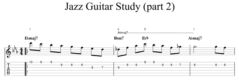 This is a jazz guitar study (part 1) with tab, scoreĀ and chord diagrams providing easy jazz lines using seventh arpeggio to play over common jazz chord changes (minor and major 2 5, major 2 5 1, and 1 6 2 5).